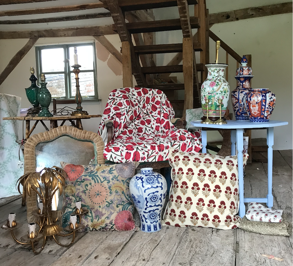 Antique and vintage furniture, rugs, cushions, lamps, lampshades and lots of objet.