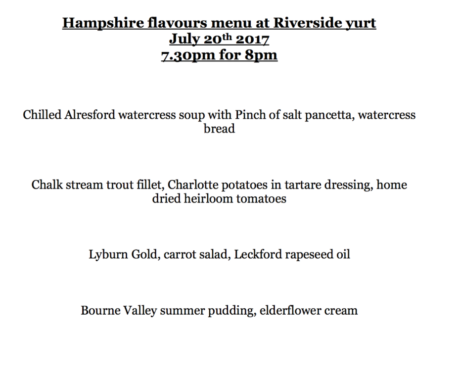 Bought to you by Hampshire Fare, The Little Kitchen Company and The Riverside Yurt, instead of meeting friends at a local restaurant, why not come and enjoy fantastic evening and indulge in a 4-course menu showcasing Hampshire flavours at the idyllic Riverside Yurt, Bransbury, Near Barton Stacey.