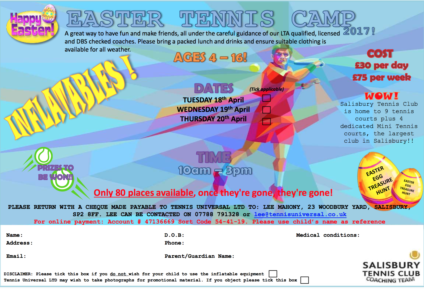 Lee Mahoney and his fun, energetic team run these fantastic all day tennis camps during the warmer (!) holidays. He has just announced their Easter tennis camps. I highly recommend – my boys did this last Summer (then aged 4, 6, 7) and loved it – there is a great balance between tennis, general ball skill all regularly mixed with plenty of FUN (inflatables and Easter Egg hunts…sounds like a dream camp for my children!).
